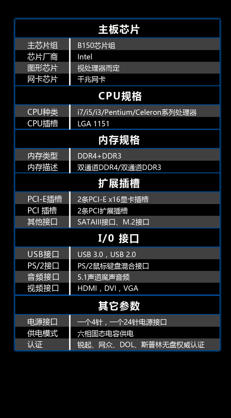 • 主芯片組:Intel B150