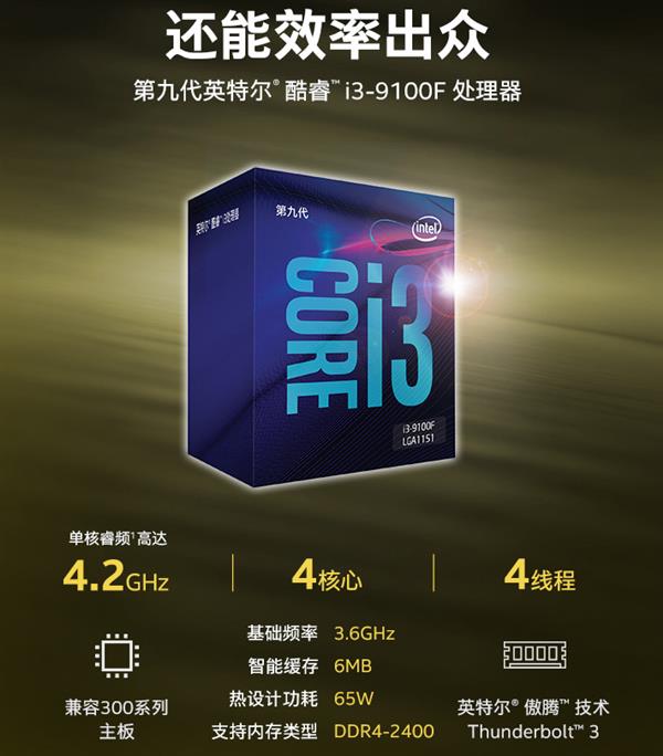 眾所周知,Intel九代的酷睿處理器,有著一個很大的改變,就是增加了帶“F”的版本,而這個帶“F”的版本,就是指不帶集顯。而作為入門級酷睿,i3-9100F會是高性能辦公裝機(jī)的好選擇,這款處理器配備44線程,6MB緩存,基礎(chǔ)頻率3.6GHz,但加速頻率提升至4.2GHz,支持DDR4-2400內(nèi)存。