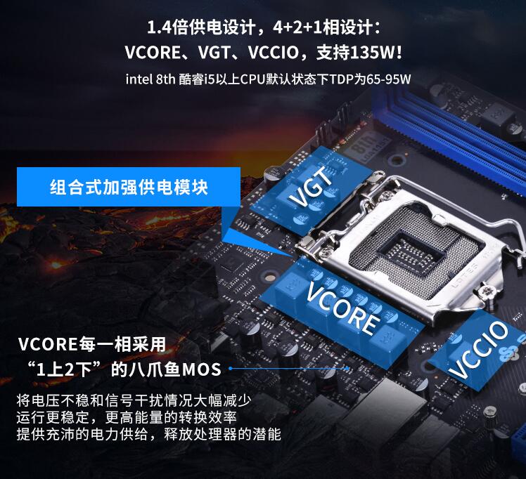 狂龍B360M,采用4+2+17相供電,完整支持酷睿6核處理器,服務(wù)器級的電器元件,全固態(tài)黑金電容,發(fā)熱量更低,低溫八爪魚MOSFET,更低阻抗更高效率,更低的發(fā)熱量提升主板的穩(wěn)定性,全封閉的鐵素體電感,完善的屏蔽能力,減少電磁干擾,散熱性能更佳穩(wěn)定高效,保證主板長久穩(wěn)定高效的使用。