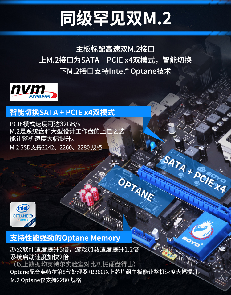 主板標(biāo)配高速雙M.2接口,智能切換SATA+PCle*4模式,速度可到32GB/S。還可支持英特爾Optane加速技術(shù),讓你的機(jī)械硬盤更上一層樓。M.2是系統(tǒng)盤和大型工作盤的上佳之選,讓整機(jī)的速度大幅提升。
